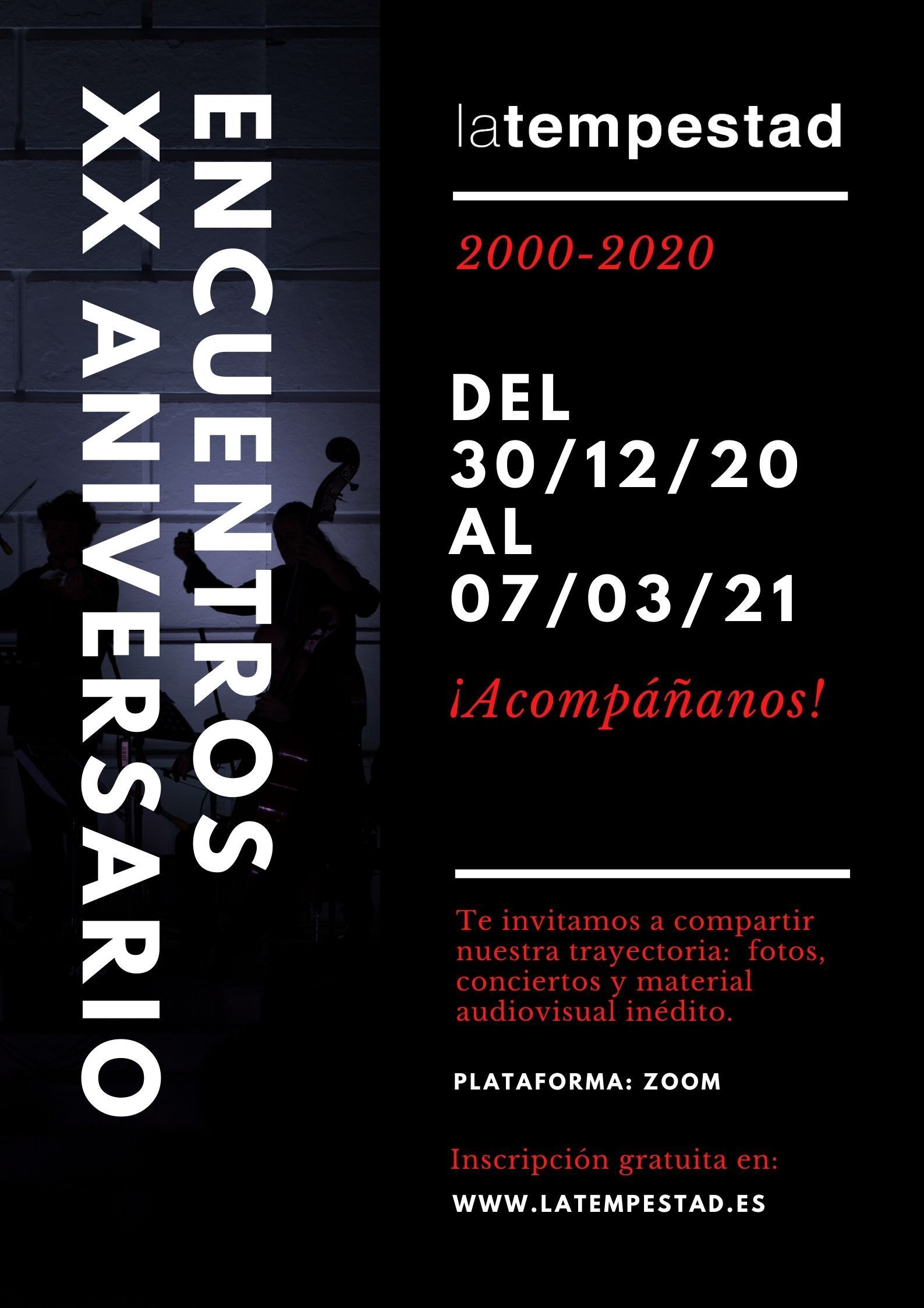 “Te invitamos a compartir nuestra trayectoria: fotos, conciertos y material audiovisual inédito”. Con este mensaje de bienvenida y antes de despedir el 2020, el ensemble musical La Tempestad comenzó el pasado 30 de dic. la celebración de su XX Aniversario con una estimulante iniciativa que, bajo el nombre Encuentros Virtuales XX Aniversario, pone a disposición del público materiales audiovisuales de su grupo, tanto publicados como inéditos a través de una plataforma digital, en la que inscribirse de forma gratuita https://forms.gle/25mw6N6vehyL4pUu5. Cada uno de los encuentros girará en torno a una temática o compositor diferente, siendo el siguiente encuentro, el del próximo domingo 10 de enero, el dedicado a Domenico Scarlatti y a otros compositores de la talla de Juan Oliver Astorga. Le seguirá Bach (24 de enero), Mozart (7 de febrero), Haydn (21 de febrero) y Brunetti & Lidón (7 de marzo).